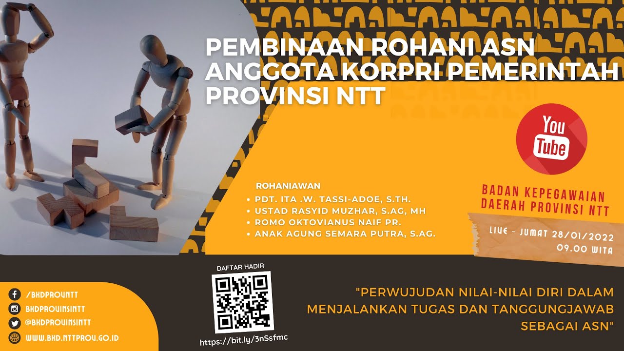 Kota Kupang, BKD.NTTPROV.GO.ID - Badan Kepegawaian Daerah Provinsi NTT menyelenggarakan Pembinaan Rohani Gabungan ASN Anggota KORPRI Lingkup Pemerintah Provinsi NTT, pada hari Jumat, 28 Januari 2022 secara virtual dan disiarkan secara live streaming melalui channel Youtube BKD Provinsi NTT. Tema Renungan : "PERWUJUDAN NILAI-NILAI DIRI DALAM MENJALANKAN TUGAS DAN TANGGUNGJAWAB SEBAGAI ASN". Hadir memberikan renungan masing-masing rohaniwan dari agama Islam : Ustad Rasyid Muzhar, S.AG,MH, agama Hindu : Bpk. Anak Agung Semara Putra, S.Ag., agama Kristen : Pdt. Ita .W. Tassi-Adoe, S.Th. dan agama Katolik : Romo Oktovianus Naif Pr. Adapun intisari renungan yang disampaikan oleh masing-masing rohaniwan yaitu :