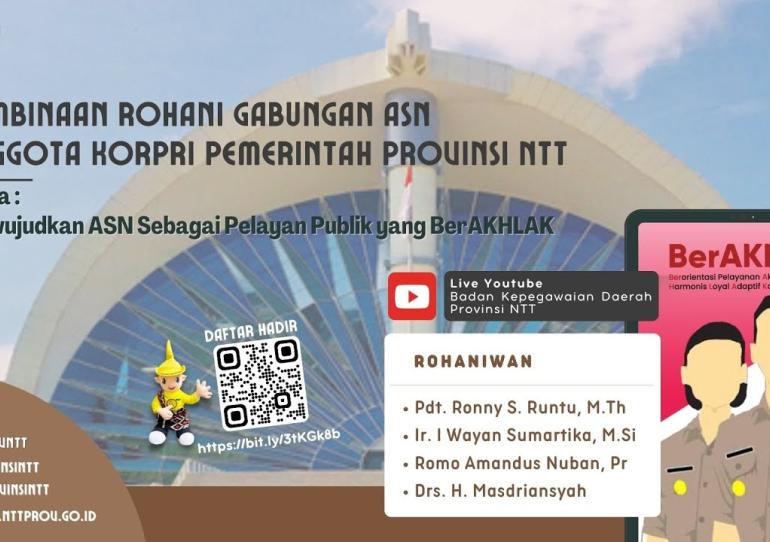 Kota Kupang, BKD.NTTPROV.GO.ID - Badan Kepegawaian Daerah Provinsi NTT menyelenggarakan Pembinaan Rohani Gabungan ASN Anggota KORPRI Lingkup Pemerintah Provinsi NTT, hari Jumat, 26 Agustus 2022 secara virtual dan disiarkan secara live streaming melalui channel Youtube BKD Provinsi NTT. Tema : “Pulih Lebih Cepat Bangkit Lebih Kuat Dalam Perspektif ASN Sebagai Pelayan Masyarakat & Perekat Serta Pemersatu Bangsa". Hadir memberikan renungan masing-masing rohaniwan dari agama Kristen : Pdt. Yandi Manobe, S.Th, agama Islam : Drs. H.