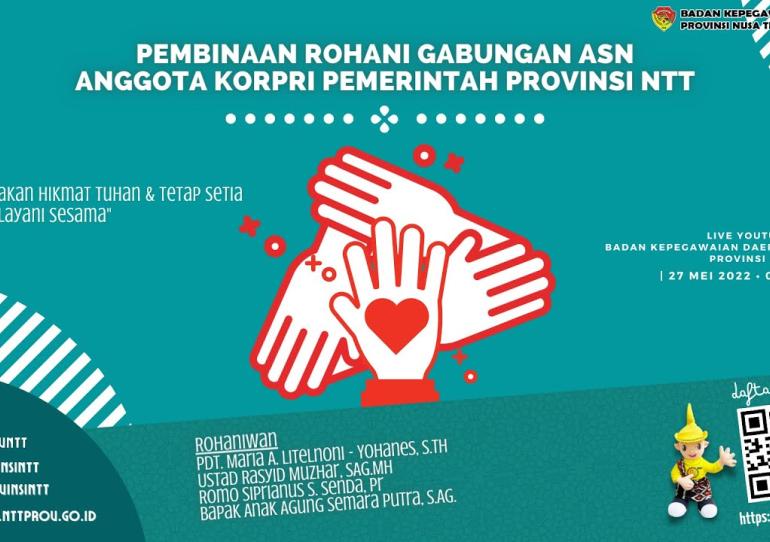 Kota Kupang, BKD.NTTPROV.GO.ID - Badan Kepegawaian Daerah Provinsi NTT menyelenggarakan Pembinaan Rohani Gabungan ASN Anggota KORPRI Lingkup Pemerintah Provinsi NTT, hari Jumat, 27 Mei 2022 secara virtual dan disiarkan secara live streaming melalui channel Youtube BKD Provinsi NTT. Tema Renungan : "Menggunakan Hikmat Tuhan & Tetap Setia Dalam Melayani Sesama". Hadir memberikan renungan masing-masing rohaniwan dari agama Kristen : Pdt. Maria A. Litelnoni - Yohanes, S.Th, agama Islam : Ustad Rasyid Muzhar, SAG.MH, agama Katolik : Romo Siprianus S.
