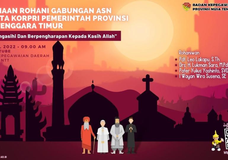 Kota Kupang, BKD.NTTPROV.GO.ID - Badan Kepegawaian Daerah Provinsi NTT menyelenggarakan Pembinaan Rohani Gabungan ASN Anggota KORPRI Lingkup Pemerintah Provinsi NTT, hari Kamis, 28 April 2022 secara virtual dan disiarkan secara live streaming melalui channel Youtube BKD Provinsi NTT. Tema Renungan : "Saling Mengasihi Dan Berpengarapan Kepada Kasih Allah" . Hadir memberikan renungan masing-masing rohaniwan dari agama Islam : Ustad Rasyid Muzhar, S.AG,MH, agama Kristen : Pdt. Leo Lakapu, S.Th, agama Islam : Drs. H.
