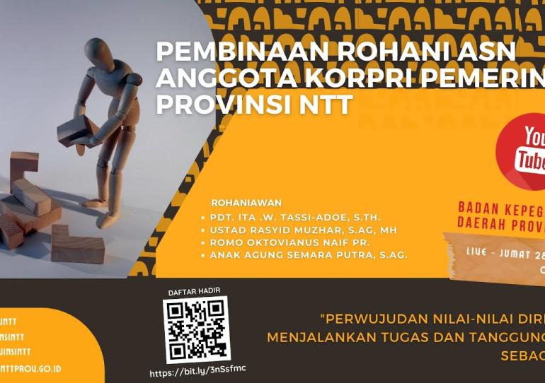 Kota Kupang, BKD.NTTPROV.GO.ID - Badan Kepegawaian Daerah Provinsi NTT menyelenggarakan Pembinaan Rohani Gabungan ASN Anggota KORPRI Lingkup Pemerintah Provinsi NTT, pada hari Jumat, 28 Januari 2022 secara virtual dan disiarkan secara live streaming melalui channel Youtube BKD Provinsi NTT. Tema Renungan : "PERWUJUDAN NILAI-NILAI DIRI DALAM MENJALANKAN TUGAS DAN TANGGUNGJAWAB SEBAGAI ASN". Hadir memberikan renungan masing-masing rohaniwan dari agama Islam : Ustad Rasyid Muzhar, S.AG,MH, agama Hindu : Bpk.