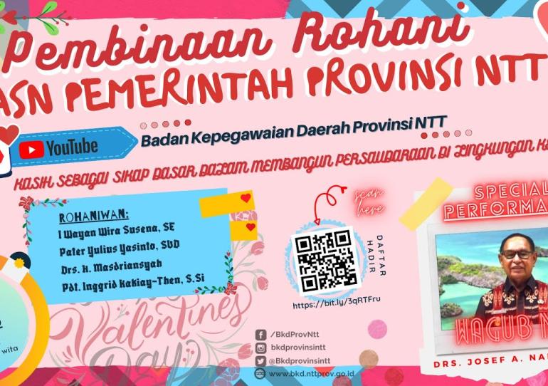Kupang- BKD.NTTPROV.GO.ID – (26/02) Badan Kepegawaian Daerah menyelenggarakan Pembinaan Rohani di bulan penuh kasih sayang. Pembinaan Rohani ini diselenggarakan secara live dari Youtube BKD Provinsi NTT. Acara berlangsung di aula Fernandez, Kantor Gubernur NTT lt. 4. Dengan tetap menerapkan protokol kesehatan. Seluruh ASN Pemprov NTT mengikuti pembinaan rohani melalui youtube dari tempat masing-masing.