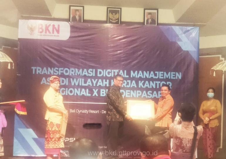 Kota Kupang, BKD.NTTPROV.GO.ID – Kepala BKD Provinsi NTT yang diwakili oleh Kepala Bidang Perencanaan, Pendidikan Aparatur dan Simpeg (PPAS) menerima piagam penghargaan BKN Award Tahun 2022 dari Deputi SINKA BKN Pusat (Kamis, 8/9/2022), bertempat di Bali Dinasty Resort. Penghargaan tersebut diberikan untuk kategori Implementasi Manajemen ASN terbaik, Penilaian Kompetensi, serta Perencanaan Kebutuhan dan Mutasi Kepegawaian. Selain itu, BKD juga memperoleh penghargaan atas approval Pengisian Data Mandiri (PDM) terbaik di wilayah kerja NTT dengan pencapaian sebesar 97,35%.