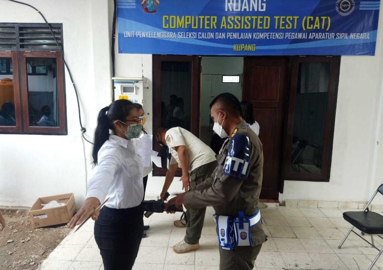 BKD.NTTPROV.GO.ID,- Hari kedua (2/12/2021), Seleksi Calon ASN Pemerintah Provinsi NTT dimulai sejak pukul 06.30 wib. Peserta yang hadir kembali mengikuti serangkaian pemeriksaan sebelum memasuki ruang ujian. Pemeriksaan suhu, penggunaan hand sanitizer, pemeriksaan hasil swab, registrasi dengan sistem face recognition, pengambilan PIN ujian serta pengarahan dari panitia seleksi.