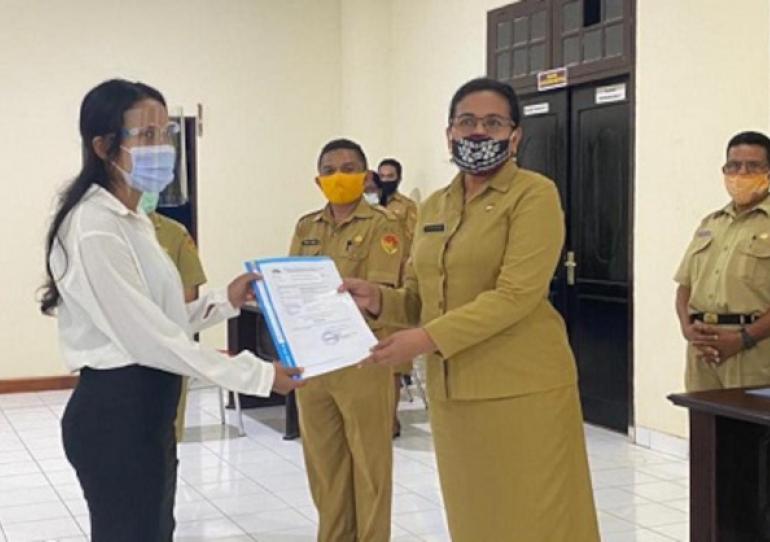 Kota Kupang, BKD.NTTPROV.GO.ID – (04/01) Pemerintah Provinsi Nusa Tenggara Timur menyerahkan Surat Keputusan Pengangkatan menjadi Calon Pegawai Negeri Sipil (SK CPNS) kepada 422 orang peserta yang lulus Seleksi CPNS Formasi Tahun 2019. Bertempat di ruang Assesment Center BKD Provinsi NTT, penyerahan SK dilakukan oleh Kepala BKD Provinsi NTT Henderina S. Laiskodat, SP, M.Si yang secara simbolis menyerahkan SK CPNS kepada perwakilan dari tiap-tiap formasi yakni, formasi guru, tenaga kesehatan dan tenaga teknis.